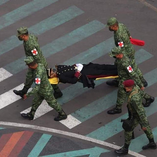 Un cadete del heroico colegio militar que participaba en el desfile cívico militar conmemorativo de los 211 años del grito de independencia se desmayó, por lo que elementos del Ejército tuvieron que trasladarlo en camilla.