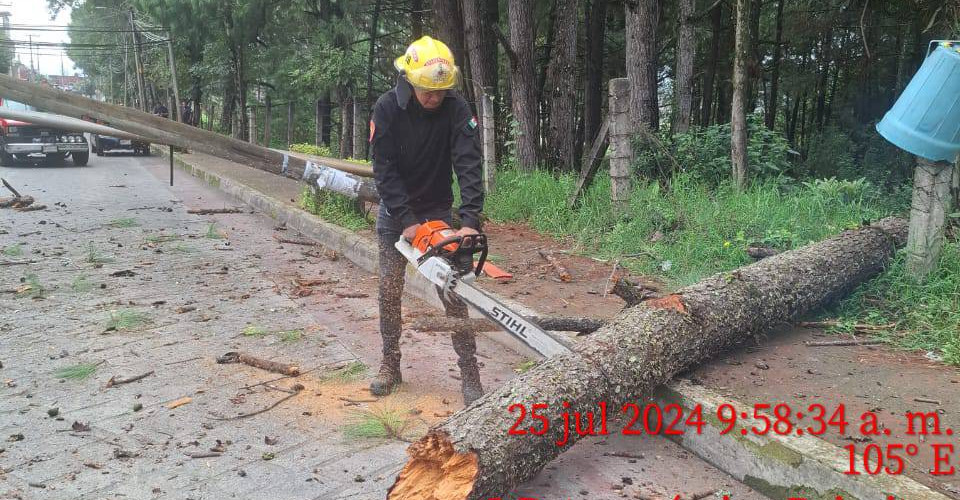 El personal de Protección Civil y Bomberos de Huauchinango se encuentra realizando trabajos de retiro de un árbol