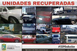 En la ciudad de Puebla, Policías Estatales lograron ubicar ocho vehículos: marca Nissan, tipo Tsuru; marca Renault, tipo Logan; camioneta Chevrolet, tipo Pick Up; marca Dodge, tipo Neón; Dodge, tipo RAM; marca Nissan, tipo Van; Volvo, tipo XC90 y un semirremolque de la marca Operbus, reportados como robados.